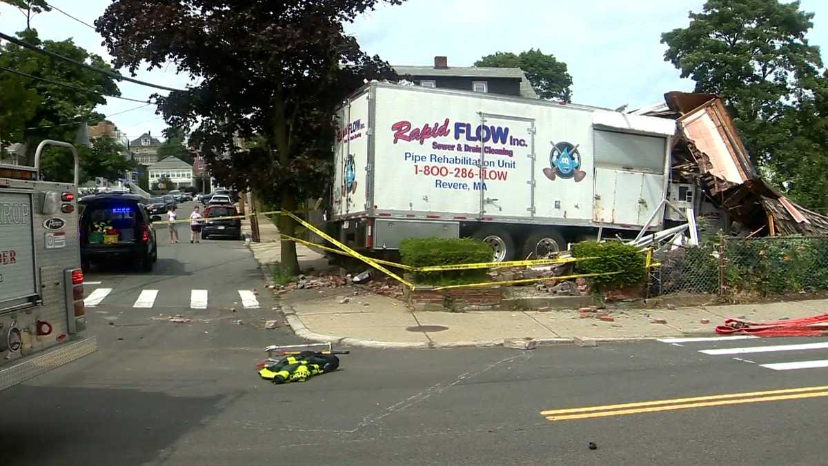 A truck belonging to Rapid Flow Inc. crashed into a building in Winthrop, Massachusetts and leveled it on June 26, 2021. Police say the crash is connected to multiple shootings that happened the same day.