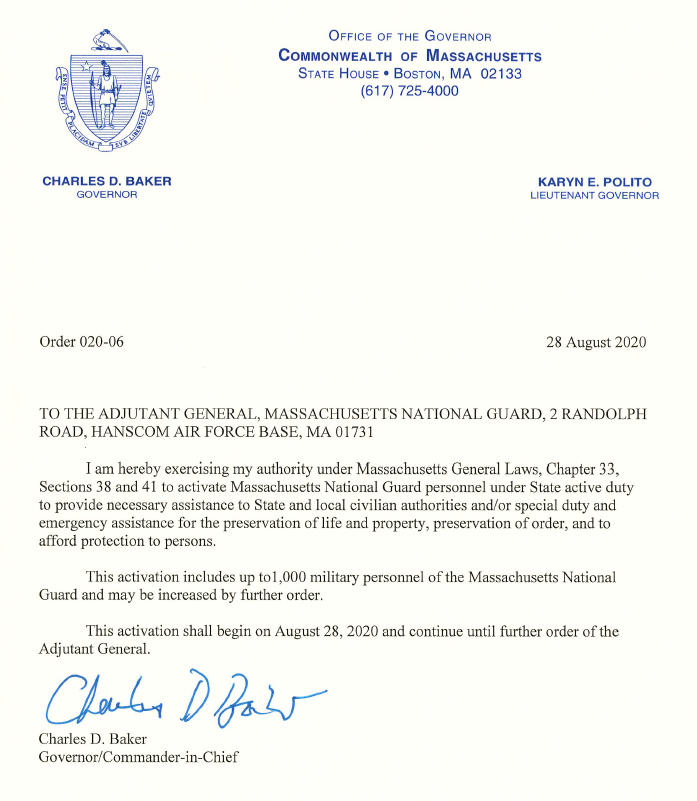MASSACHUSETTS ( Free Cape Cod News) – Up to 1000 members of the Massachusetts National Guard were activated to state active duty Friday by Governor Charlie Baker. The Executive Office of Public Safety and Security said in a statement the governor signed it “in the event that municipal leaders require their assistance.”